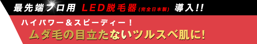 最先端のプロ用LED脱毛機を導入しています。従来の脱毛機(IPL等)と違い、毛周期に関係なく短期間で脱毛できます。めんどうなジェルの塗布・拭き取りも不要です。スムーズな高速照射と広照射面で時短脱毛が可能です。回数を重ねるごとに毛量は減少し、毛も細くなり、満足な減毛結果を得られます。